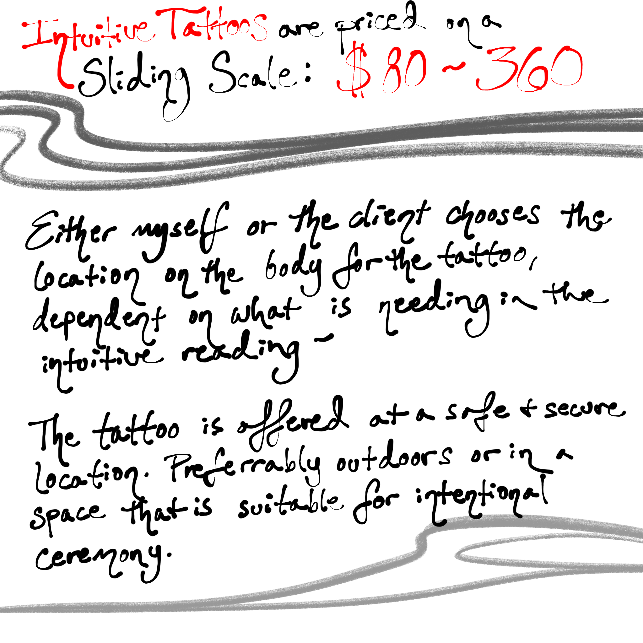 Be well rested, hydrated, and fed before receiving tattoo. Take some deep breaths! It is a commitment! Being of sound mind is important. Trust your Artist! If your instinct is not feeling right with the process then that is okay! Ask any questions and communicate any needs and your nervousness as necessary; we will move through it. Listen to your body. You are welcome to bring a friend for support.