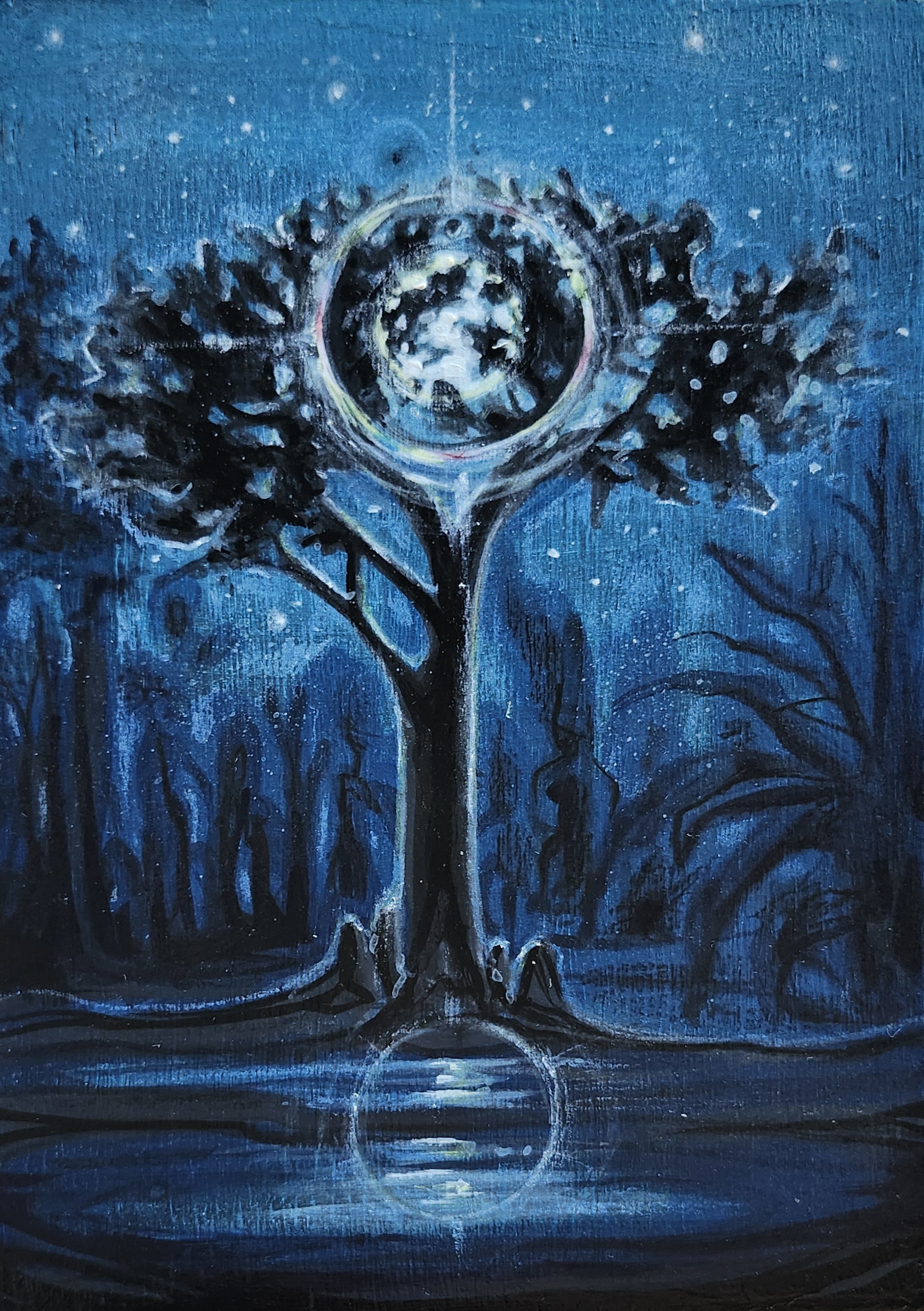 it was the serenade of sound that carried us in the softness of this scene. To paint this meant knowing that the songs coming from the den were only borrowed from the same insects that hummed outside in this glen where I stood bare to stare. All those shushes and wilts from the lips of our guide were chimed in time like those crickets who use the vessels of leaves to carry their sweet crones to the rest of their hive. Noise that our ears are not equipped to hear. But I had the milk of the vine in me to really transcribe the vibe of it, so I heard it loud and clear. Those vocal crescendos that a human tongue strives to find are just attempts at the glorious tones of jubilant flowers. How loud are their colors and how much do we pine to love them? The language of plants and their multitude of tiny hosts is an entangled microsmic symphony and it is only with our gift for desire, for sensitivity, that we can earn it. It is that same finesse that makes a brushstroke worthy too if you’re in any want to try to translate it. It was the prism of moon glow in this light that I noticed but it’s the nighttime songs that call me back to it in any given moment when I need it most and those my body will never forget. It means listening in such awe and rapture to have it recreated here. The rest of the world, so noisy, so obsessed with destruction ~ for bullying what is good and true and so consumed by distractions ~ so very completely lost from where we all come from, from what has always been near, what is right here, what just shines on and on and on: what beauty has entirely in her power to transform in us if we just let her lead us.